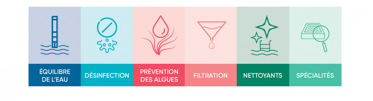 - des noms de catégories très précises associés à un code couleur : Équilibre de l'eau (bleu marine), Désinfection (bleu turquoise), Prévention des algues (rouge), Filtration (rose), Nettoyants (vert foncé), Spécialités (vert clair).