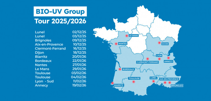 Du 2 décembre 2025 au 24 février 2026, les équipes de BIO-UV Group sillonneront le pays pour venir à la rencontre des professionnels de la piscine. Objectifs de ce BIO-UV Group Tour : permettre aux pisciniers de mieux maîtriser les technologies et les produits pour améliorer l'installation et la maintenance des piscines et procurer un meilleur service à leur clientèle.