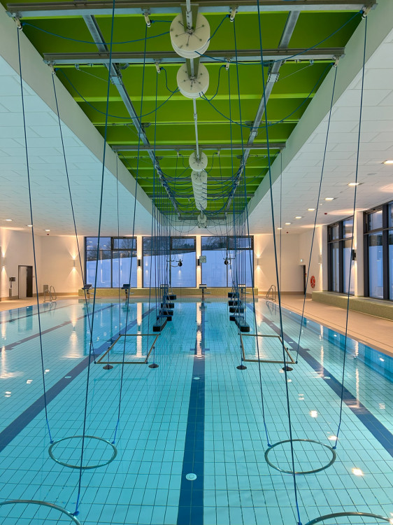 L'installation peut s'adapter aux piscines existantes ou en construction, dès 1,35 m de profondeur et 10 m de longueur. Toutefois, une profondeur de 1,80 m est recommandée pour bénéficier d'un parcours optimal avec tous les modules. Les éléments sont interchangeables et la maintenance aisée, avec un accès sans vidange du bassin.